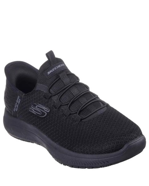 - Experience slip resistant safety with slip on convenience wearing Skechers Hands Free Slip ins® Work™: Summits SR Enslee. This TOUCHLESS FIT® work style features a knit mesh and synthetic upper with our exclusive heel pillow™, a slip resistant outsole, plus a Skechers Air Cooled Memory Foam® cushioned comfort insole.